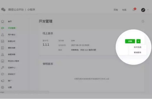 当小程序线上服务发生故障时,开发者可在“开发管理-线上版本”内选择回退版本并恢复小程序正常服务。